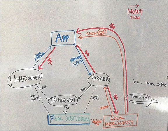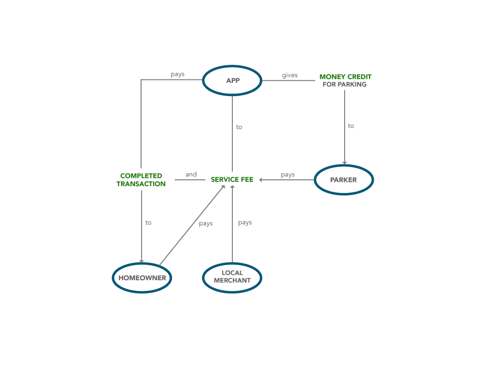 As the users co-creates the value through interaction with the service provider, we want to sketch the possible future from this service by seeing the ecology of value flow. Where the revenue resource might from? We initially probed on 3rd parties, and found that the local stores are connecting parkers and homeowners in a way it serves as a destination of where people want to park. This complicates the customer/service relationship, which might add value to our service.