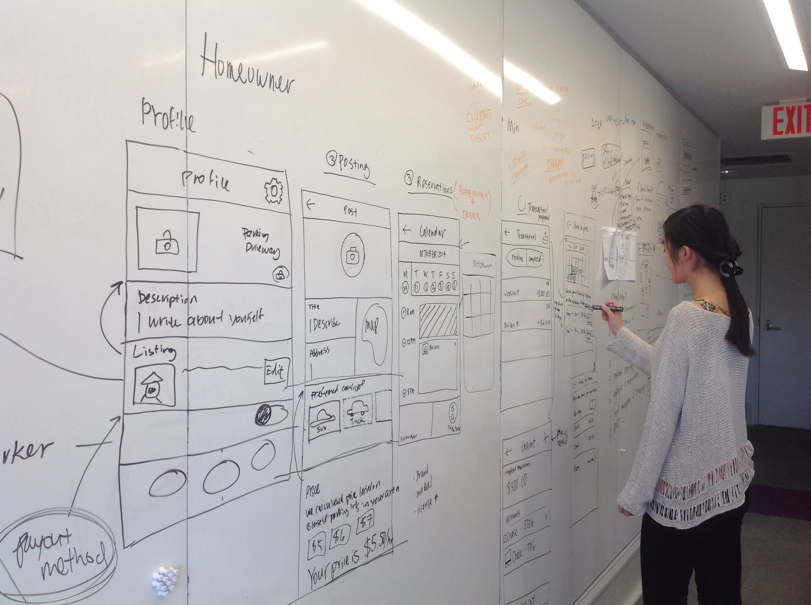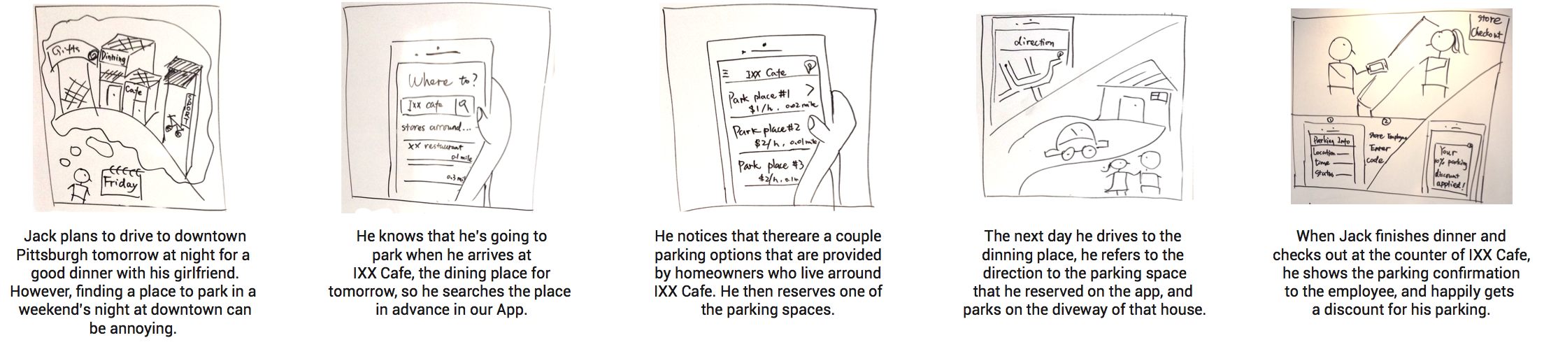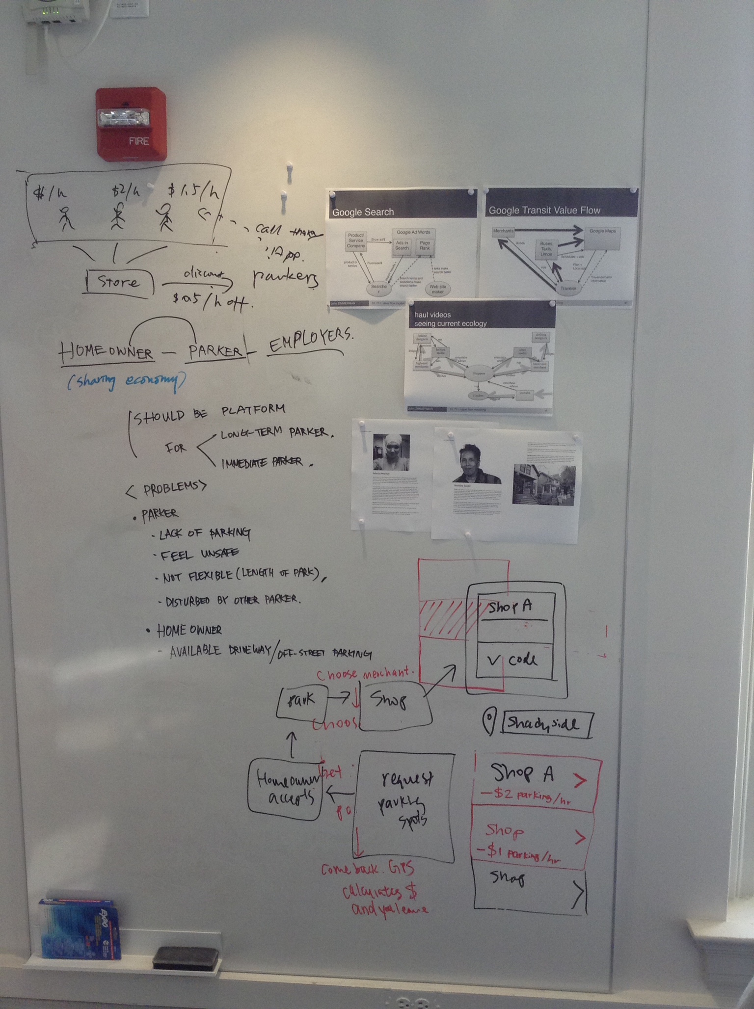 As collecting feedback from the class & professor Zimmerman, we moved away from the idea that local merchants are directly associated with the service, as it seems high risk and creates much more complexity into service execution. Given the project time of 1 month, we shifted to focus on only homeowner-parker scenarios and really work on excelling those scenarios and the designs driven by that story.