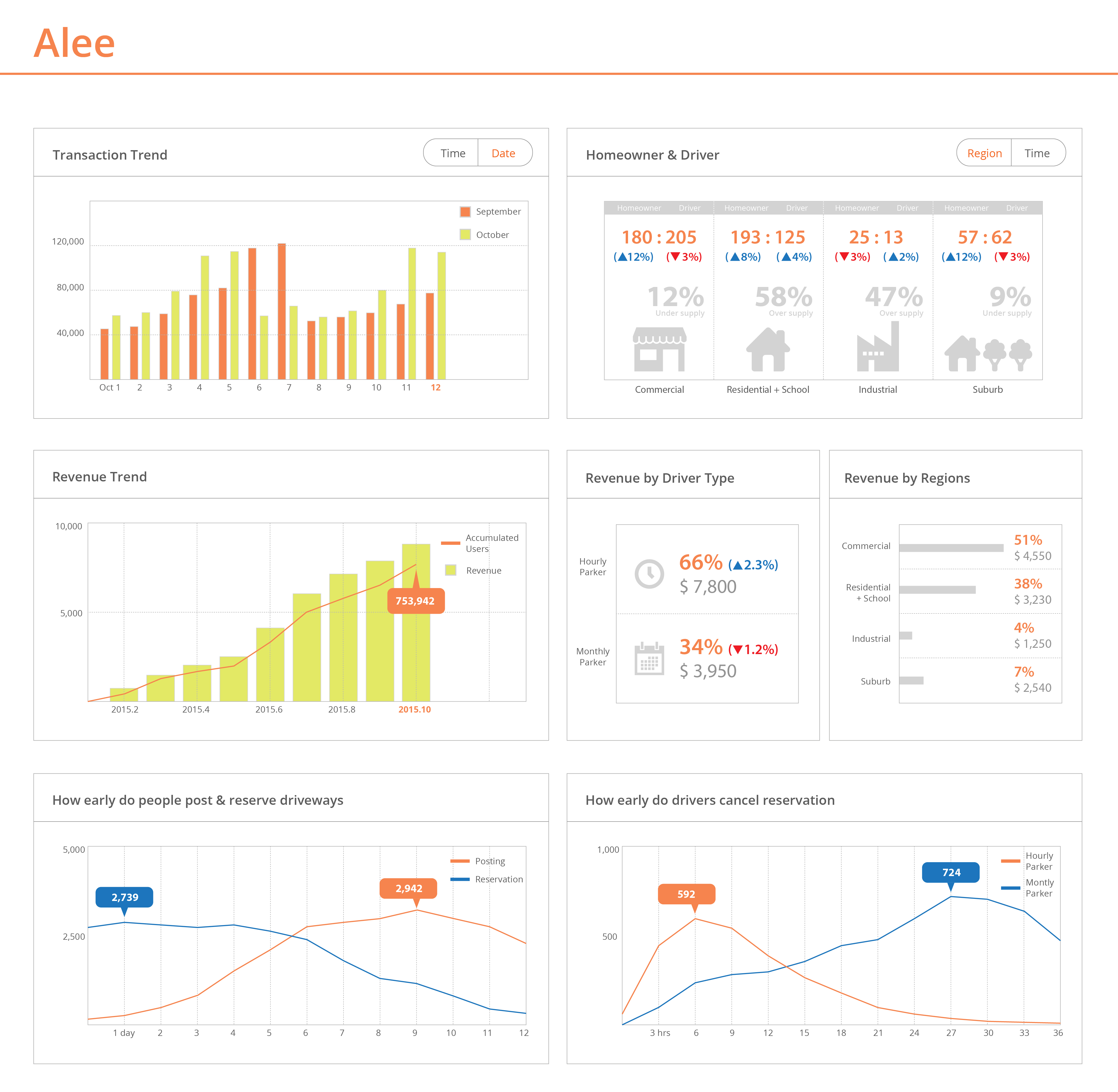 For instance, from the behaviors related to reservations monitoring, the Alee team can figure out what policies of time limits to set for posting a reservation & cancellation; in our scenario pitched before, “Rebecca can cancel a reservation no later than one day before the reservation happens”, is this a good time frame? We can gain some data via this dashboard by looking at generally when drivers cancel reservations, and really try to validate whether that’s a right design decision or not.