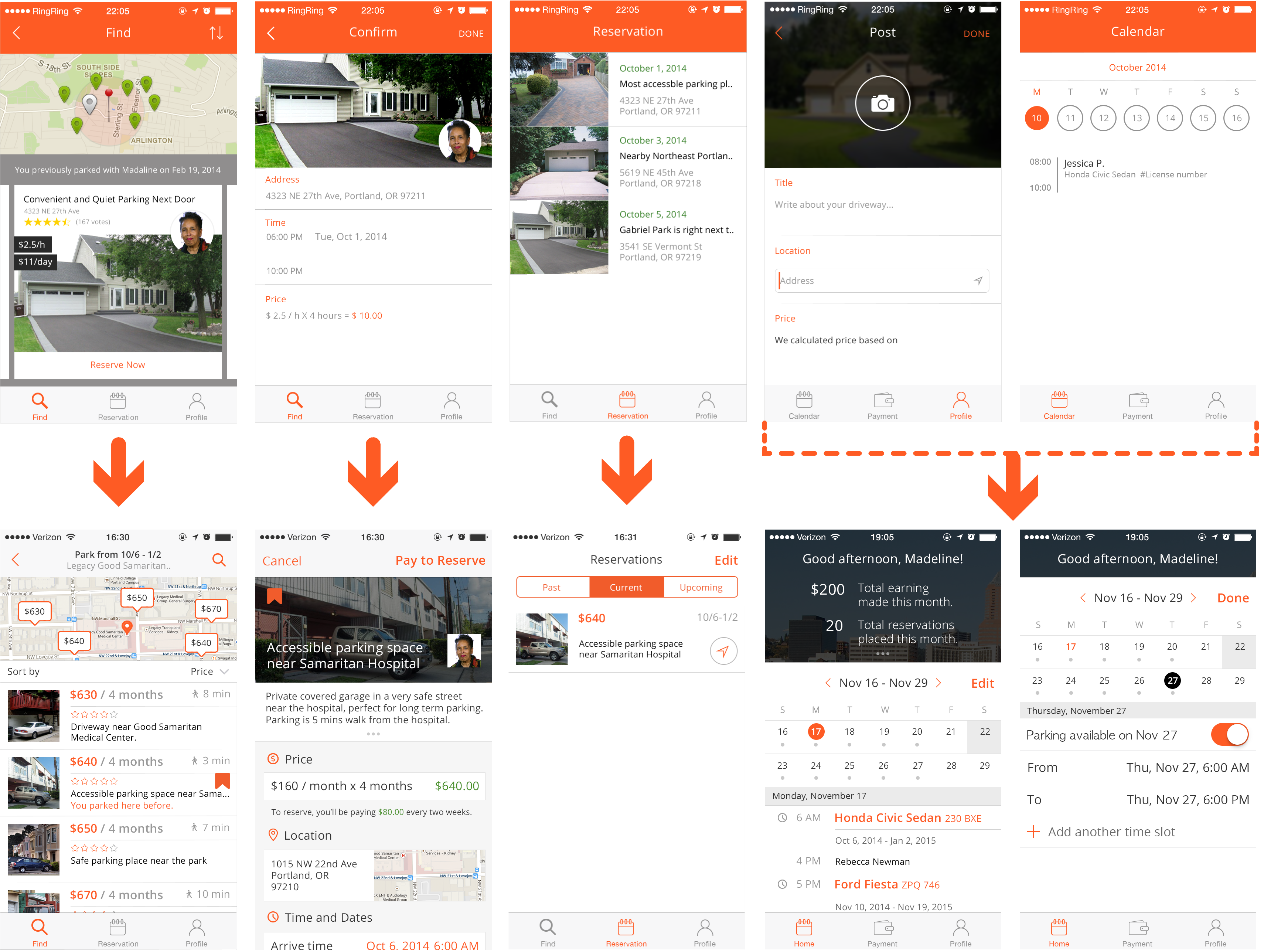“Rebecca is a nurse at Good Samaritan Hospital… …She changes the length of time she wants to park from 6 AM to 4 pm and sets end repeat to 4 months from oct 6th when her morning shift will end… …she gets a list of suggested driveways sorted by price. Looking through the list, she notices… …gets a notification that her reservation has been canceled on Thanksgiving. She sees other recommended driveways that are similar to Madeline’s and reserves one of them… …”