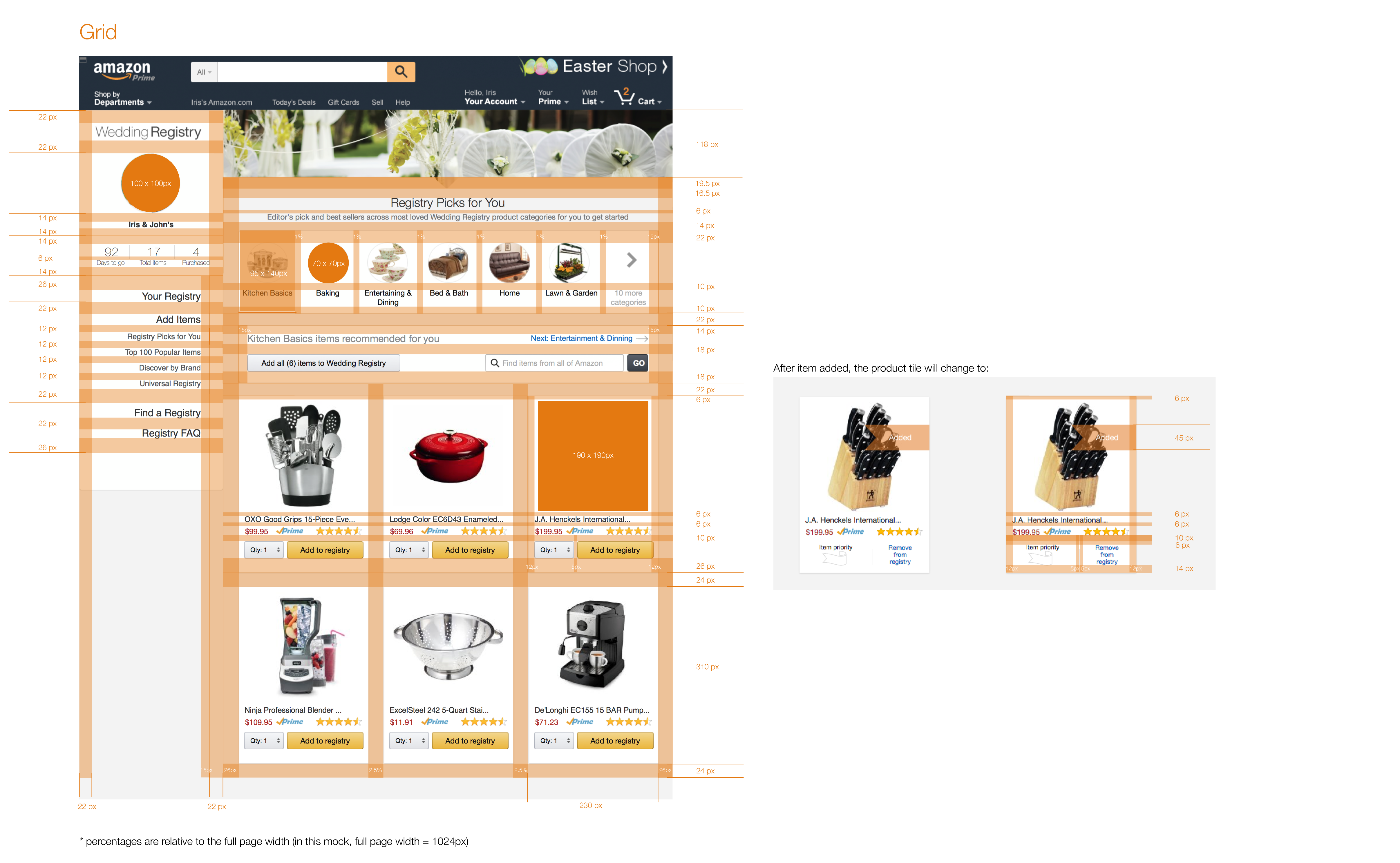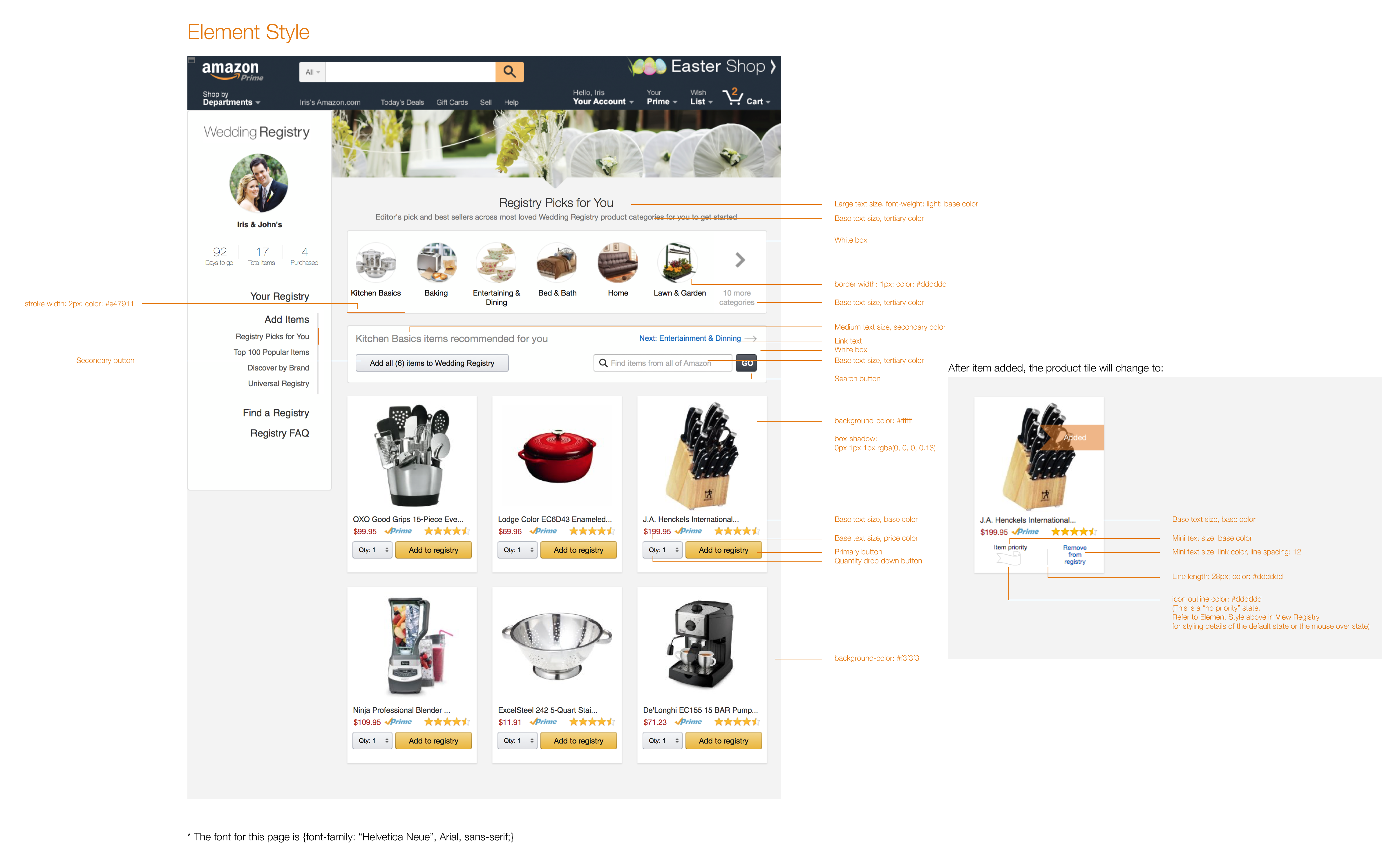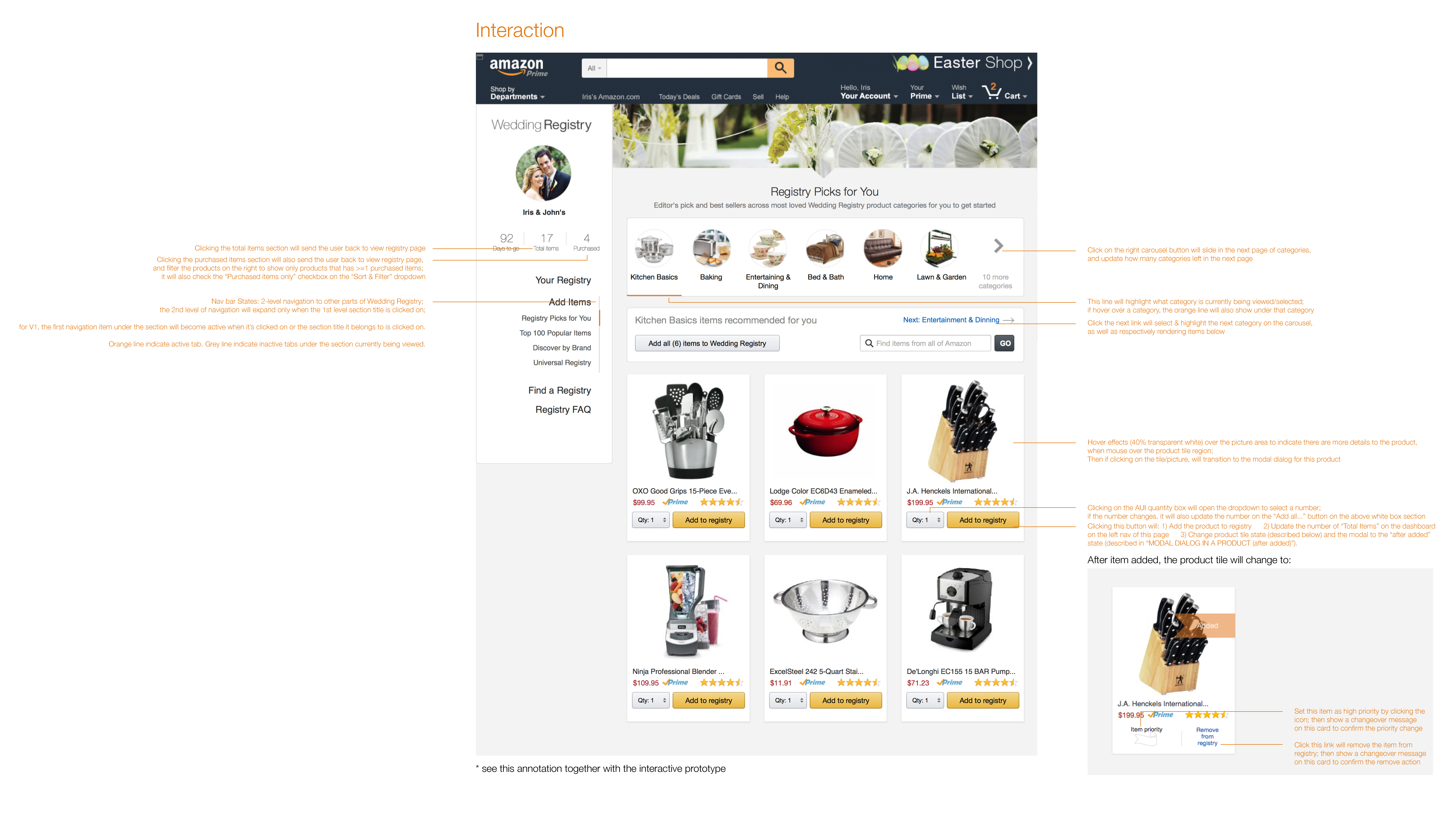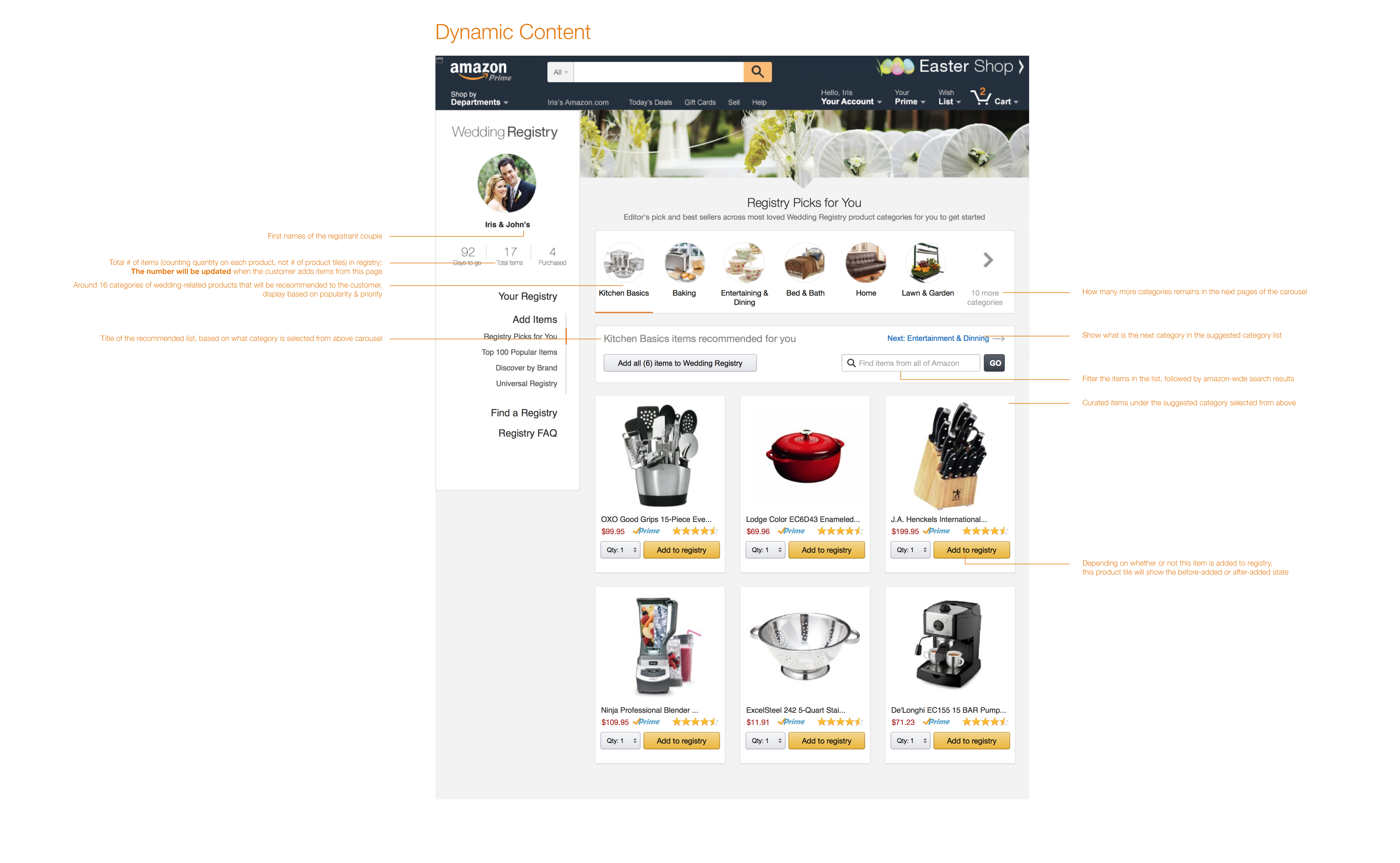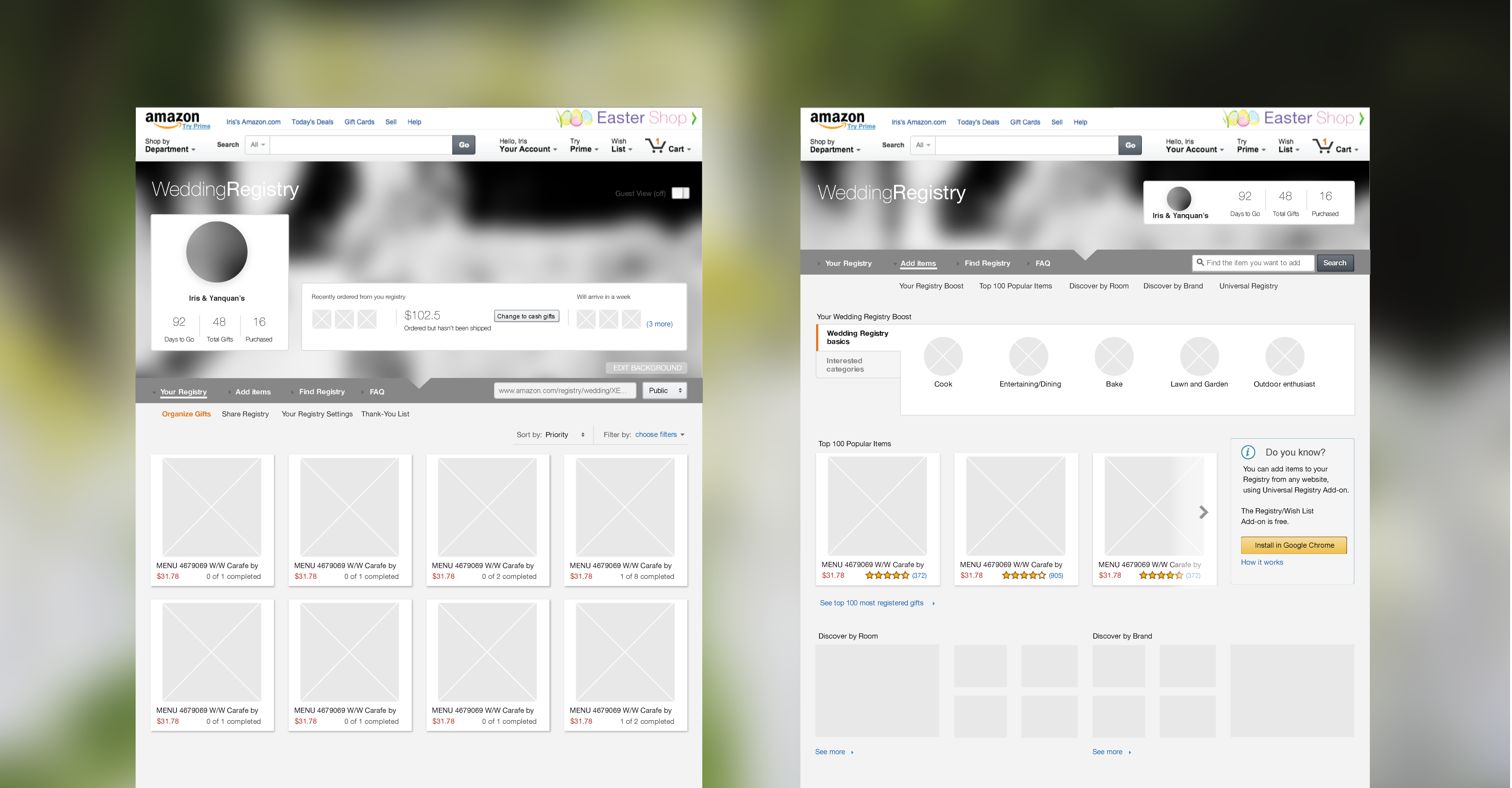 Challenge: This was my biggest baby project in Amazon for the past year. Any redesign problem likely has a number of solutions, so the challenge and opportunity for Wedding Registry is to look a little further than the simply checking all the requirement boxes and look for a solution that also engages our customers’ hearts. Also, the team need to start lean and build smart for v1, while knowing it’s a long-term initiative for the full redesign.