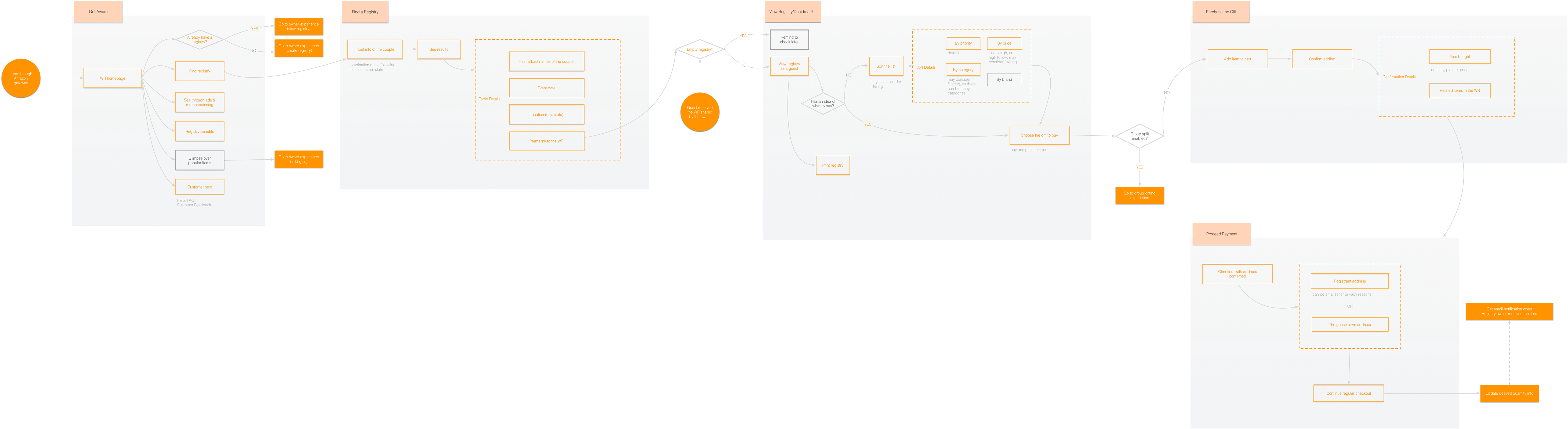 Upcoming enhancements are going to catch other important opportunities of the entire end-to-end wedding registry experience besides the view registry & add items flows in v1.0. To help envision the product opportunities going forward from v1.0, I went back to the experience map I created during initial project exploration phase. It helped present to my business partners by marking potential pitfalls in the gated experience based on user behavior, customer feedback, & user research.