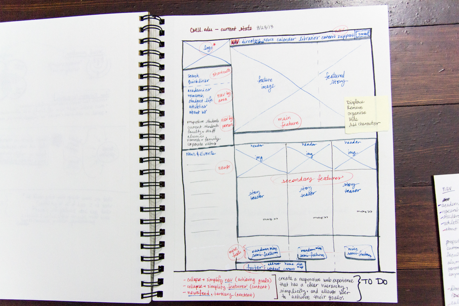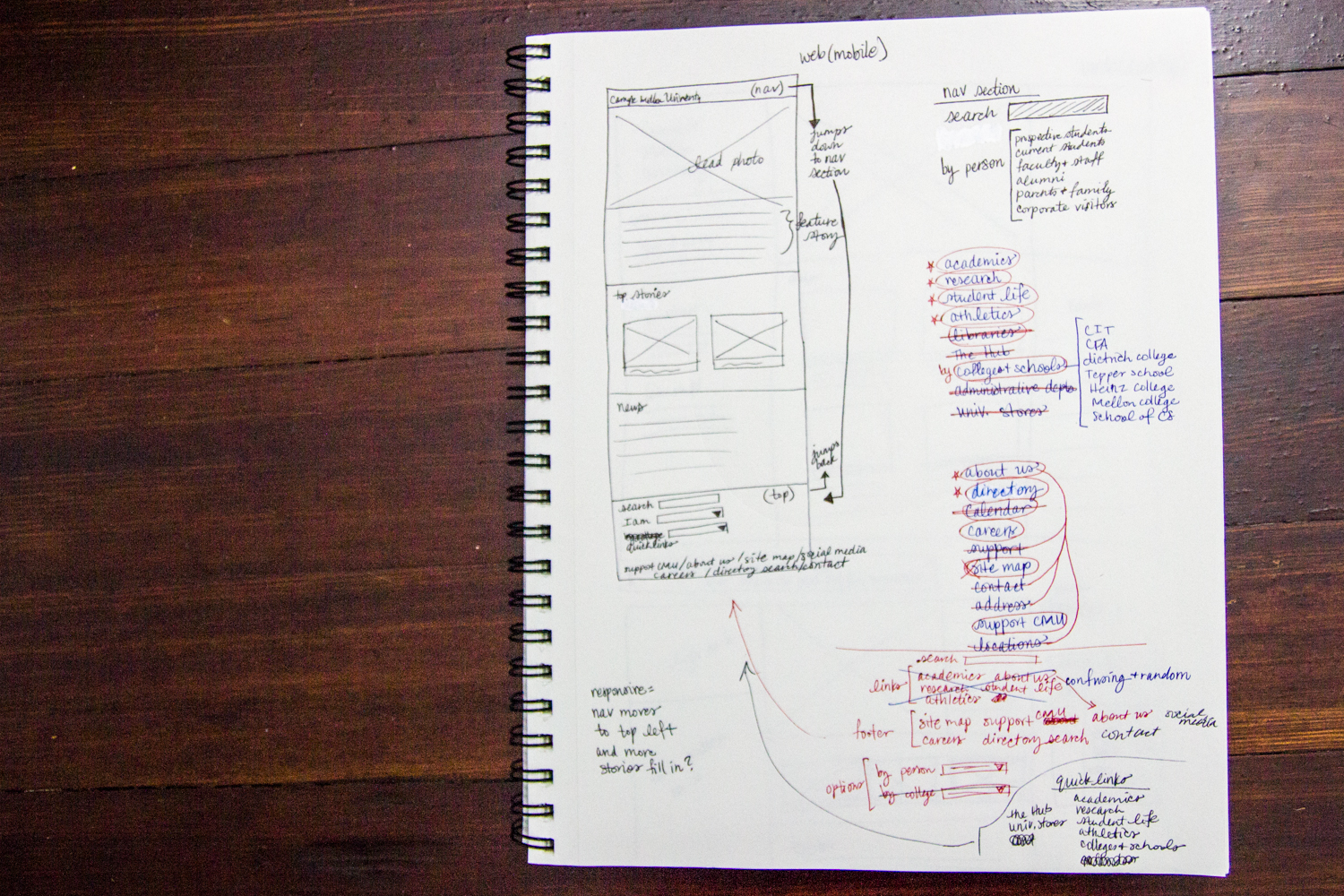 Most of my thinking about this project was around content and navigation. I eliminated options with care. I realize that calendar might be a hot link that a certain population has grown accustomed to having on the front page, but it’s really easy to get to with one extra click. In general, all the things that went away were links that are literally one click away on another page. I also bumped up the visibility of the search to help counteract this.
