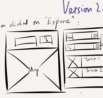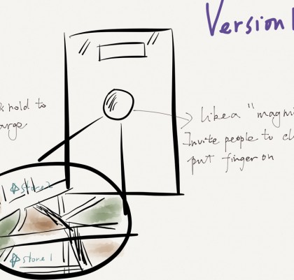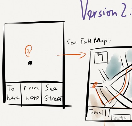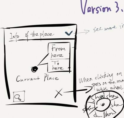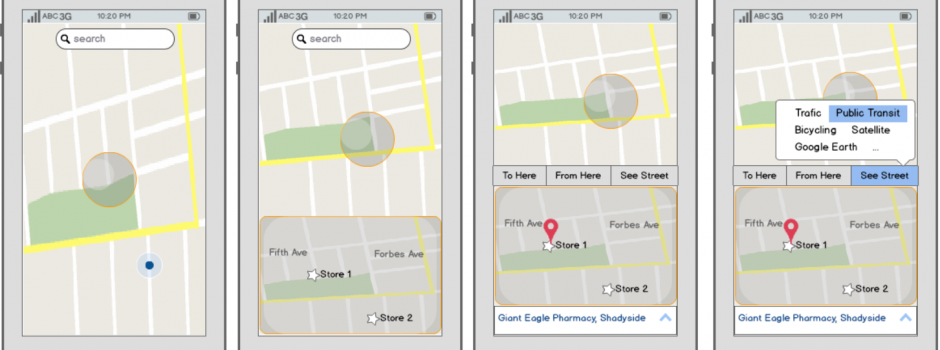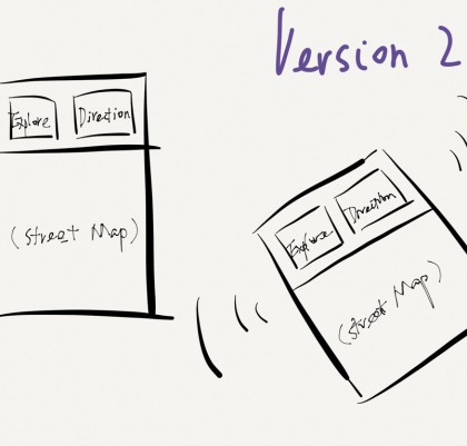 Design decision: I chose to go further with the version that has a magnifier for the Google Maps interface. The reason is that it has the affordance for users to manipulate in a natural pattern just like a magnifier – a quicker and more fluid preview of the places. Also from the preview, the user can get directions to/from it just as simple as other versions. The advantage is that with a magnifier, going back and forth from the exploring function and the direction function becomes identifiable for any users, regardless of their levels experience. It can be easier and less error-prone for the user to map exploring function with the magnifier, than what is in the version 2 toggle between functions by shaking and clicking buttons. The flow as a whole is connected comprehensively and more smoothly than other versions in my initial design directions.