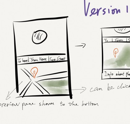 The new design: In general, contextual inquiry of Google Maps indicated that the original design has patterns that are not at all natural to the users. There are so much tiny stuff that need the users to learn and figure out. It can be extremely troublesome for novice users. Inconsistent controls such as searching for a single place and searching for a pair of places, transitions between maps view and search view, identification between information pane and search bar appear to be annoying, and users are hard to remember where is the function, let alone mapping the functions with various specific icon/controls. User is confused about where to click on in order to do what they want. My design of the new version is to reduce the confusions by making a naturally appealing interface, eliminating unnecessary controls in some steps and reinforcing the immediate actions, so that users won’t be annoyed by so much options throwing at them at a time.