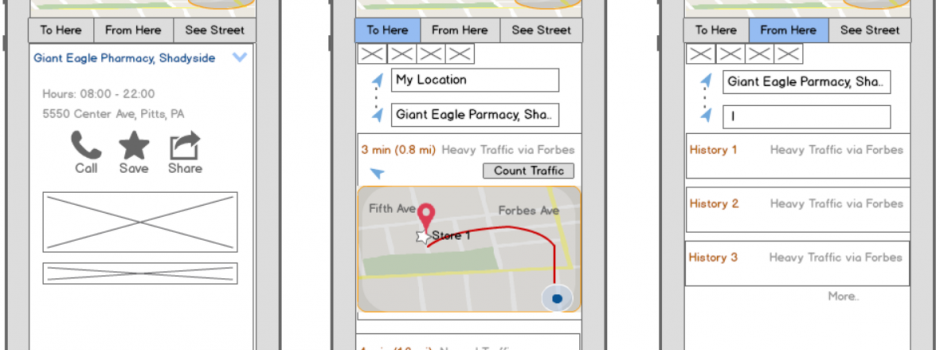 Design rationale (enlightened from Contextual Inquiry): From the contextual inquiry, I learned that there are so many functions need to be reflected in a limited size screen, and the user always need to figure out what buttons to go with. Why not make the flow more fluid so that users will identify what to do quickly? For instance, according to the user, zooming area is not clear without any direction indication (line 21-23); exploring function is not clearly mapped with the drawer, which will be opened on the left side of the screen to help users see road information in various capabilities(line 89-106) – I redesigned the interface by having a magnifier so that where to move the map is directional to the movement of the magnifier, from which the map can be zoomed in, and within the zoomed-in area users can freely view street information by choosing the menu just on top of the preview pane. Also, to solve the problem of no obvious direction marked once a place is searched out (line 76-81, line 85-93, line 113), I placed the direction options just on top of the preview pane. In the original Google Maps application, the historical data always covers the input search box and thus generates distraction for the user to efficiently input new places to search, I also resolved the problem in my design that input boxes are always empty, it will only show options of history data when being clicked. In order to avoid confusions regarding searching a single place or searching a pair of from-to places, the search box is by default designed to be a single place search, and it will change to a directional search (needs to input both “from” address and “to” address) only when the user chooses to do so, by clicking a button next to the default search status.