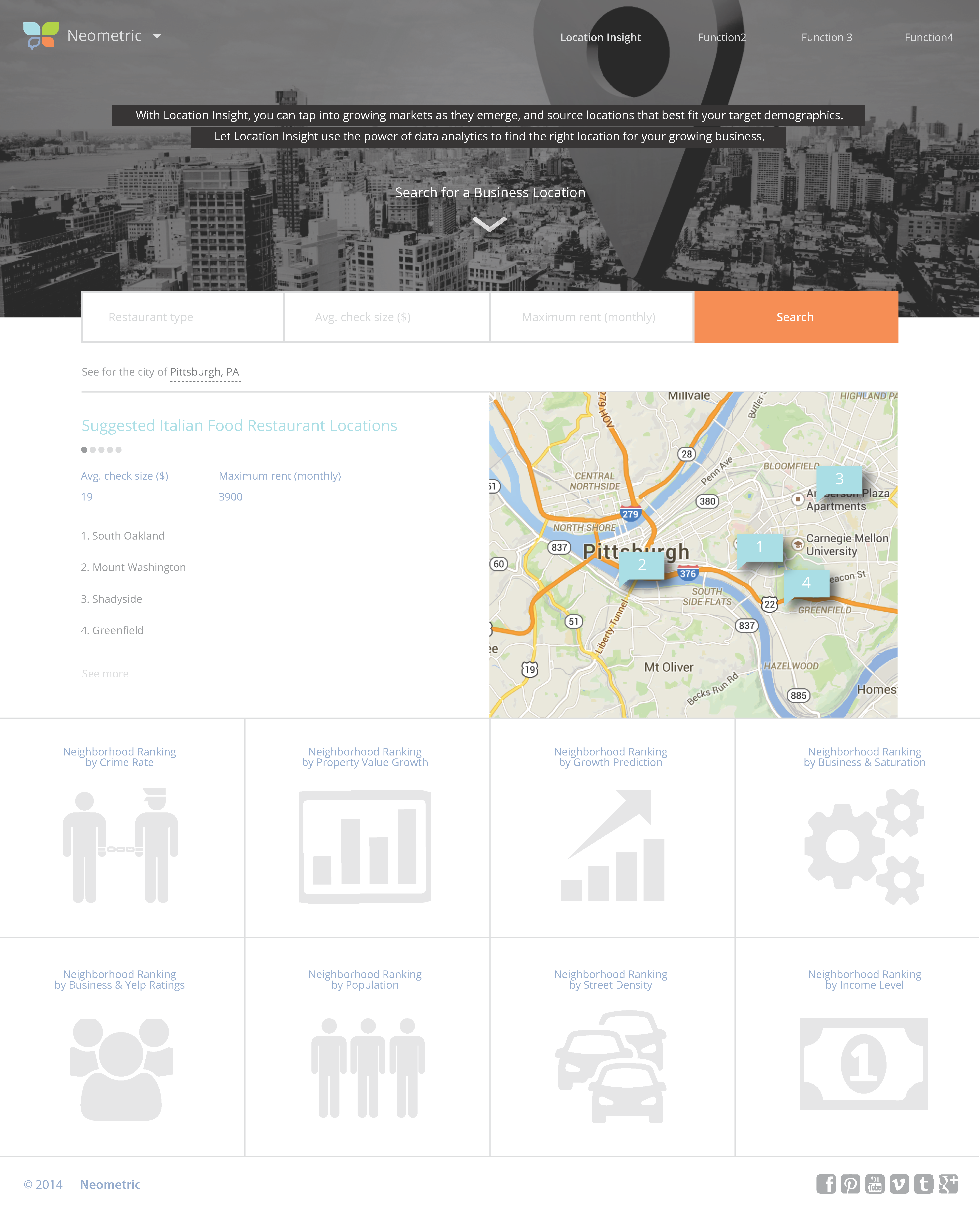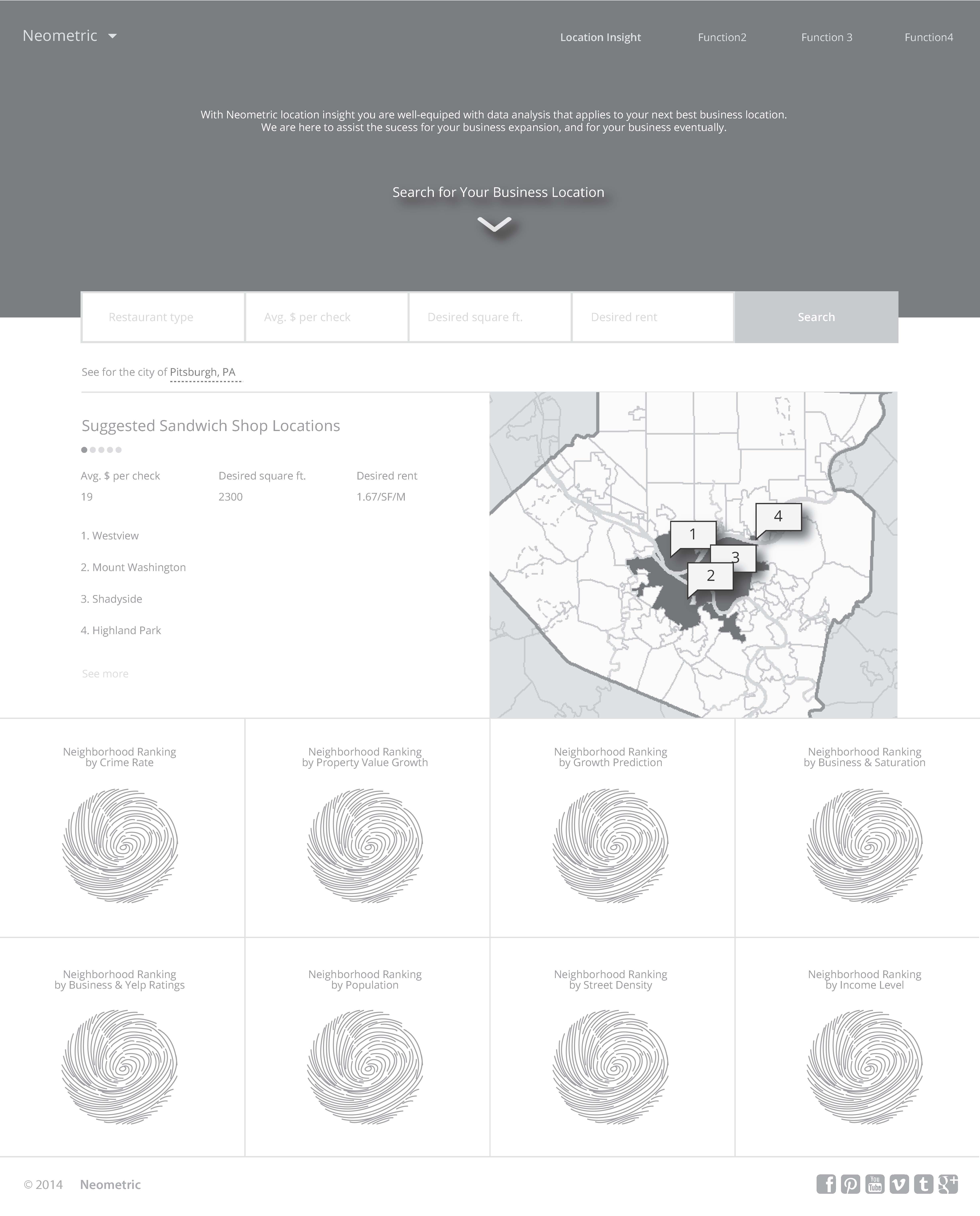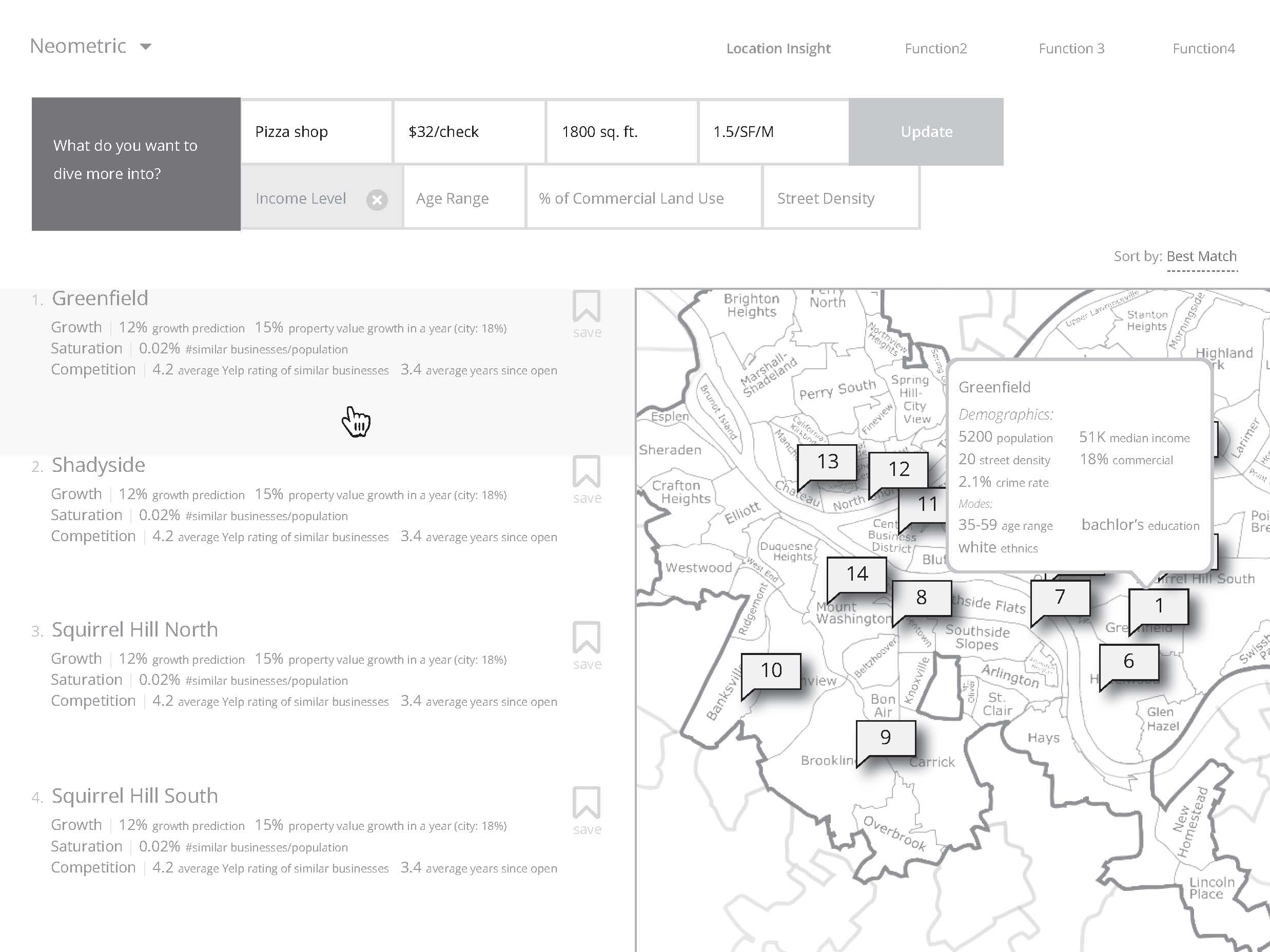 The vision of this iteration of the product is to create a web application that allows a user to search for a new location within Pittsburgh, providing: