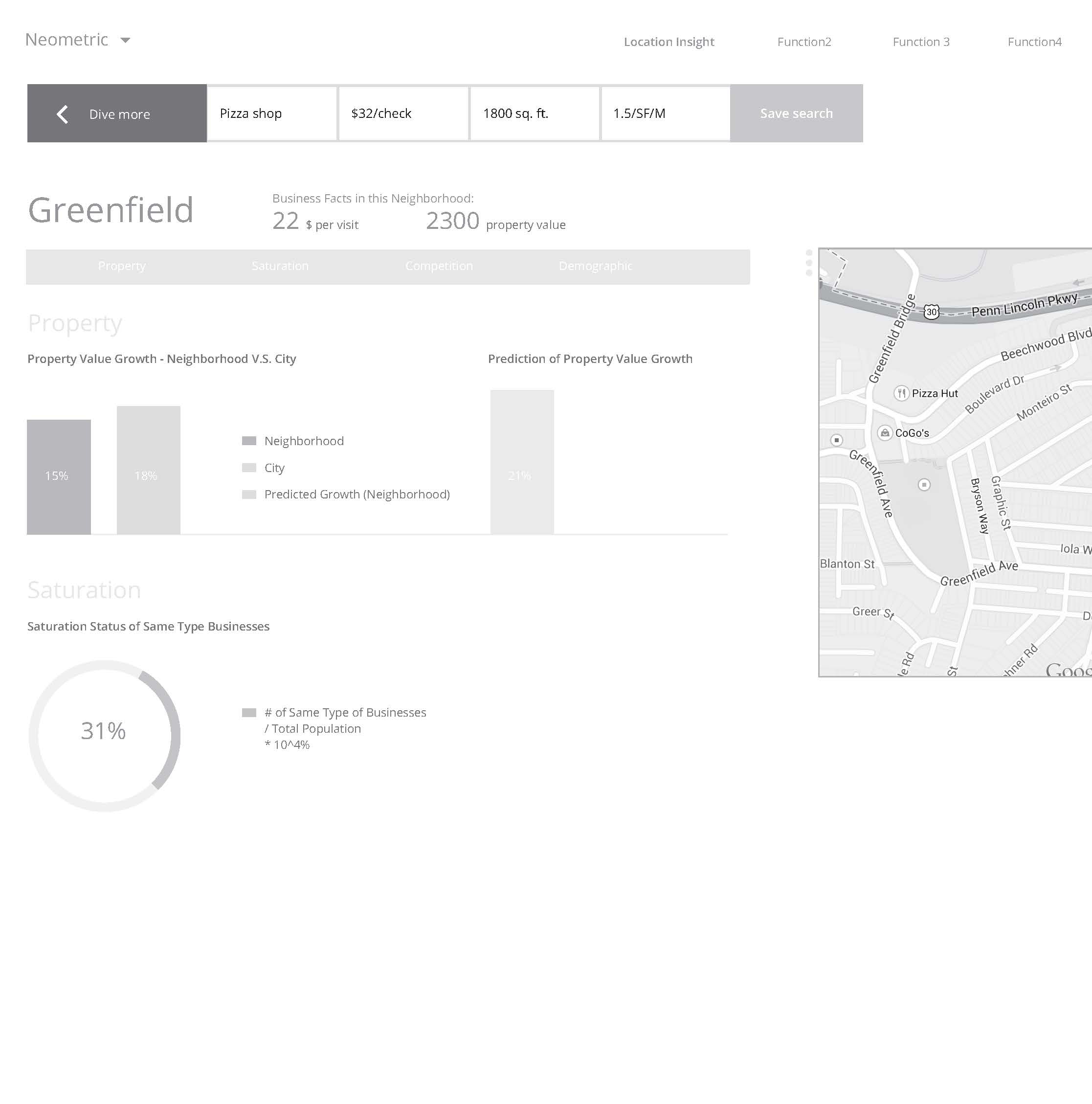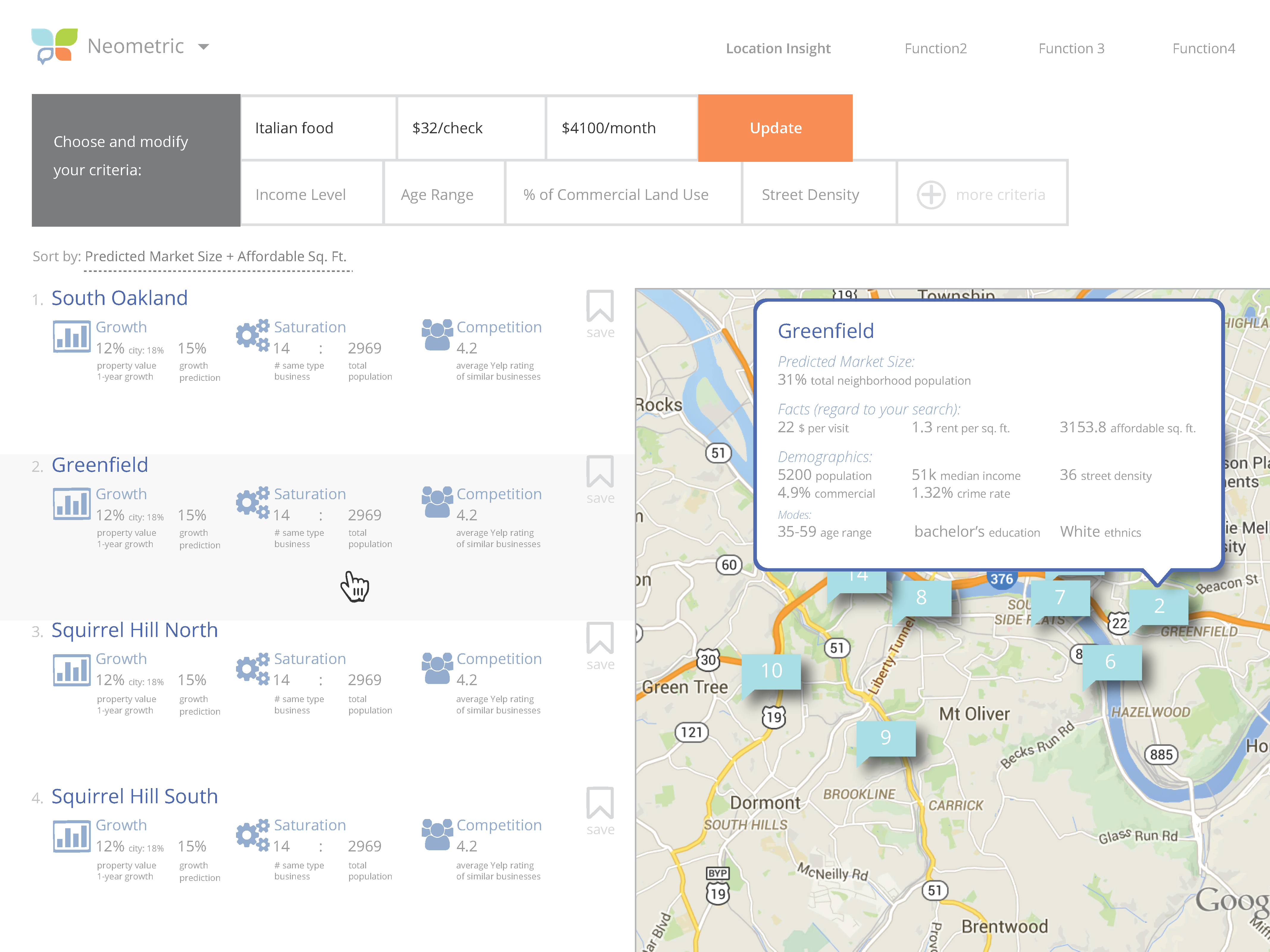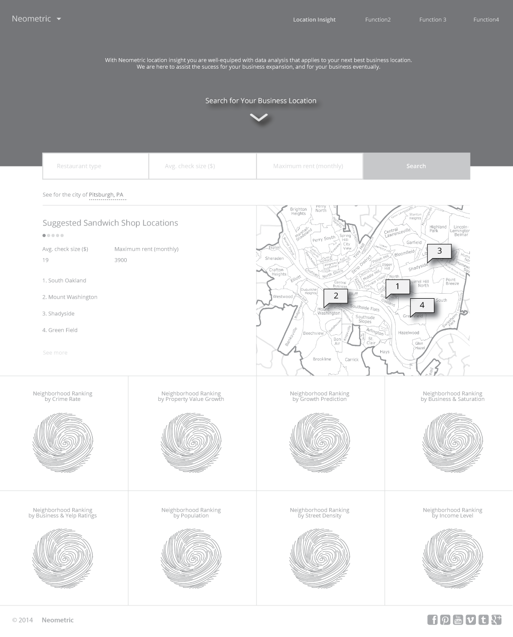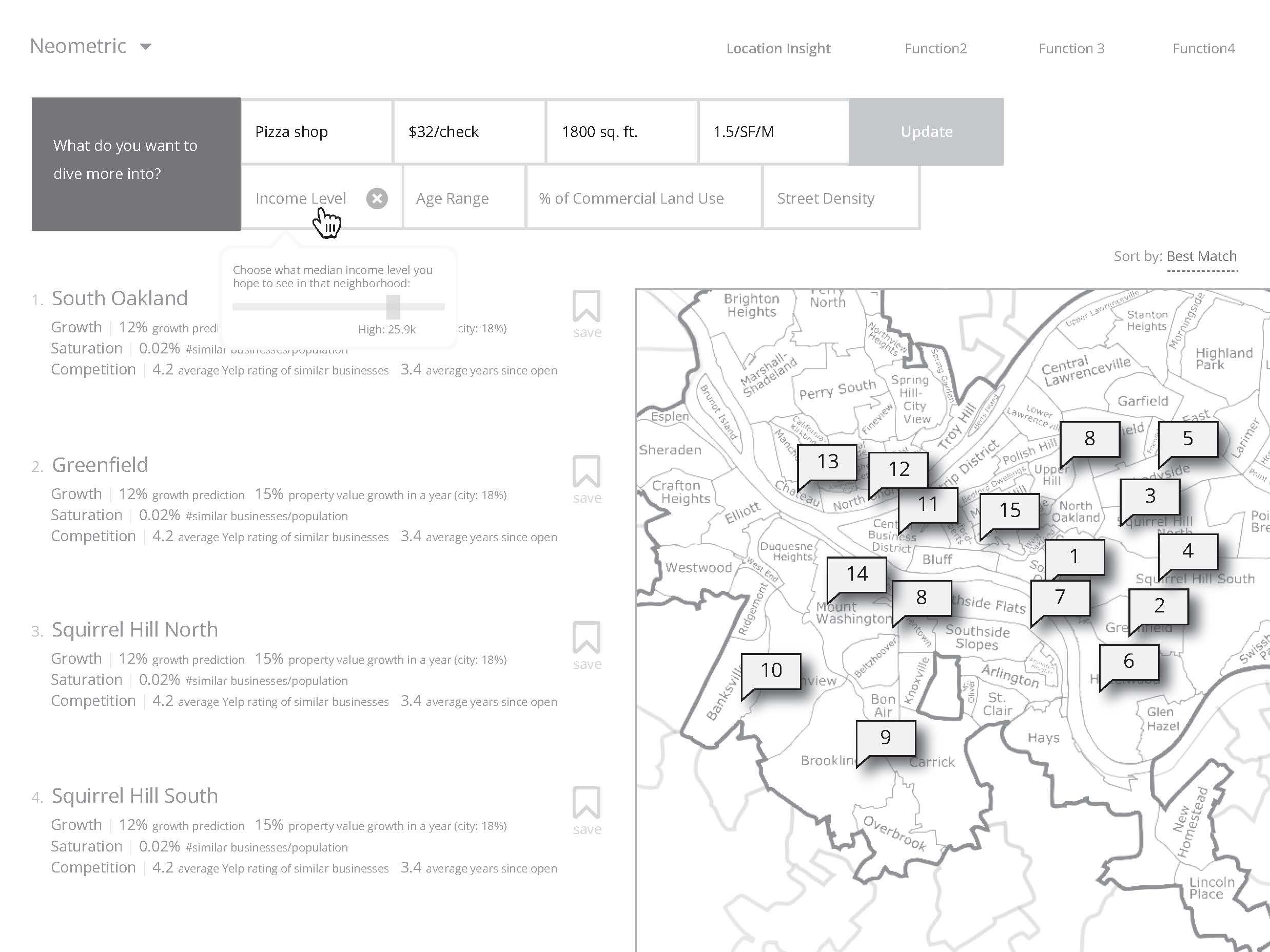 The vision of this iteration of the product is to create a web application that allows a user to search for a new location within Pittsburgh, providing: