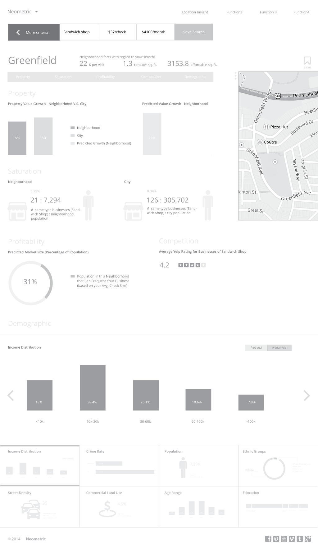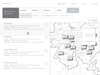 Introducing the solution – LOCATION INSIGHT: It’s a web-based product provides a user with the necessary information needed to determine where to expand a business location. Collecting voluntary user information such as menu pricing, Location Insight will perform predictive analytics to best-match user input to potential geographical areas. The service is based on publicly available data (APIs from Yelp!, Zillow and the Census Bureau), instead of proprietary information; the output will be displayed through simple tabular and map-based visuals, to appeal to non-technical users.