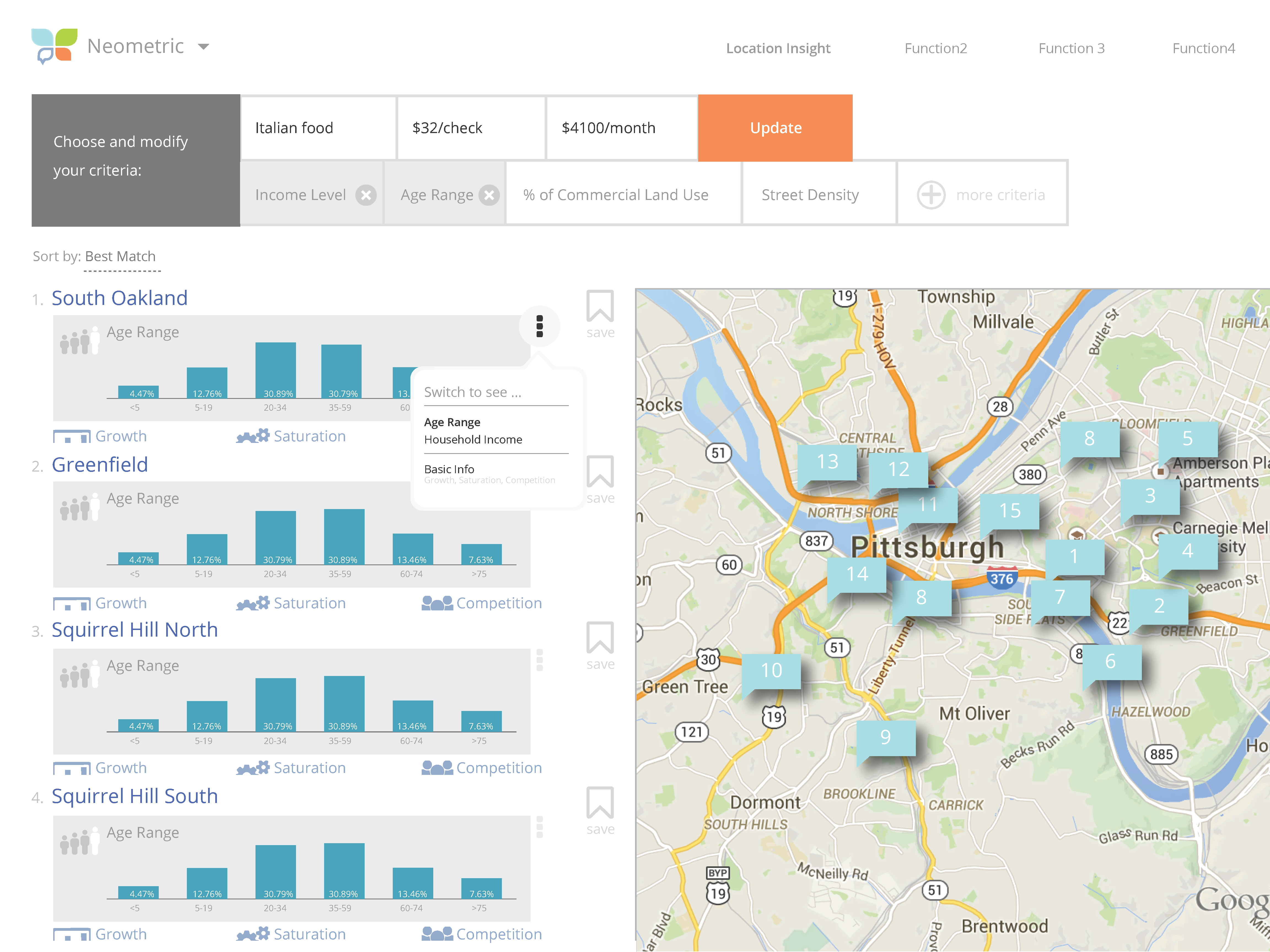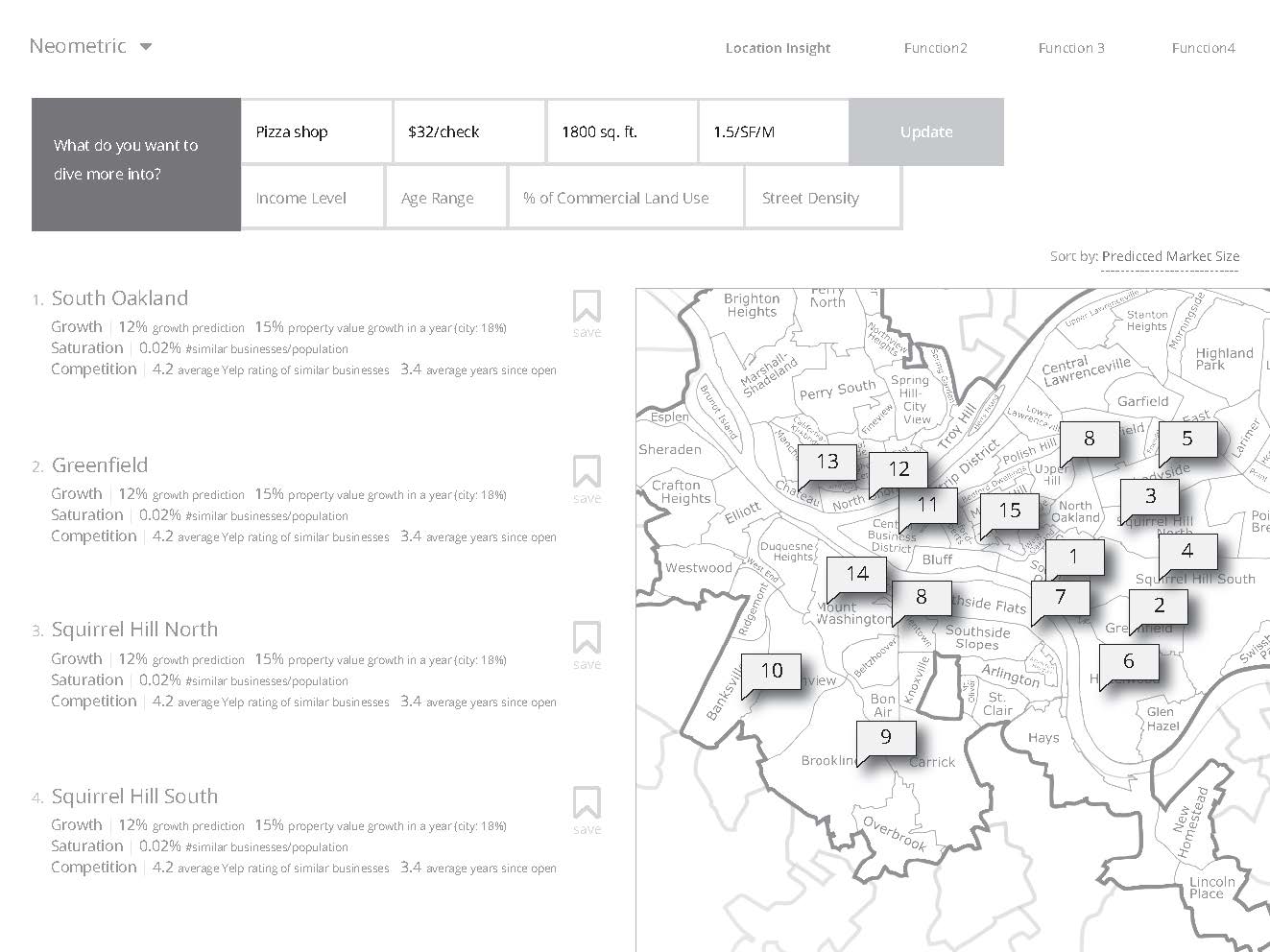 Using the $USD checksize, the web application will approximate a predicted market size (PMS) based on the Household Income Distribution (HHI) in each neighborhood, and use this information to predict potential relocation areas that will be ranked according to their probability for success.