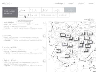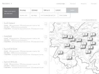 Talking with 11 potential users from 3 different industries (local restaurants and restaurants chains, optical service chains, members of the hospitality services), we found that prior to relocating or expanding a business,the business owner needs to know the demographics of the potential area, what properties are available, and detailed information about those properties. We grouped the considerations in finding a new business location into three key areas as follows: